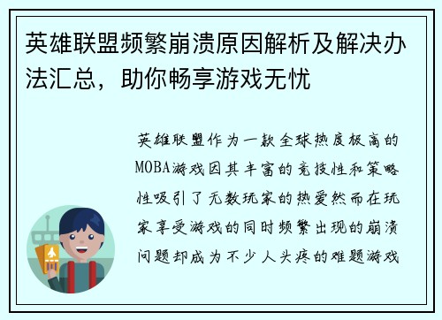 英雄联盟频繁崩溃原因解析及解决办法汇总,助你畅享游戏无忧