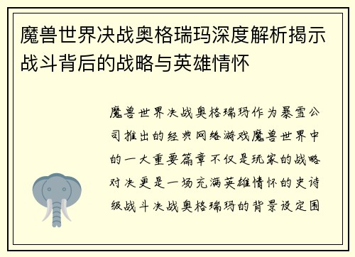 魔兽世界决战奥格瑞玛深度解析揭示战斗背后的战略与英雄情怀