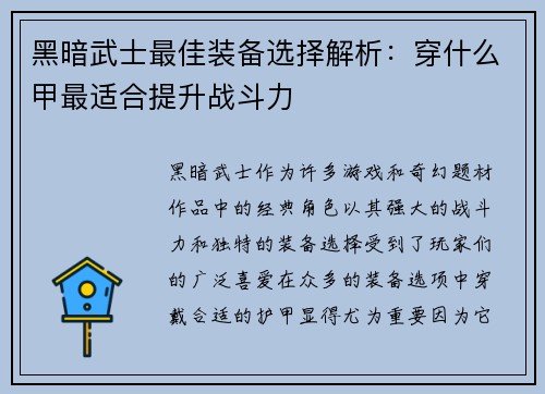 黑暗武士最佳装备选择解析:穿什么甲最适合提升战斗力